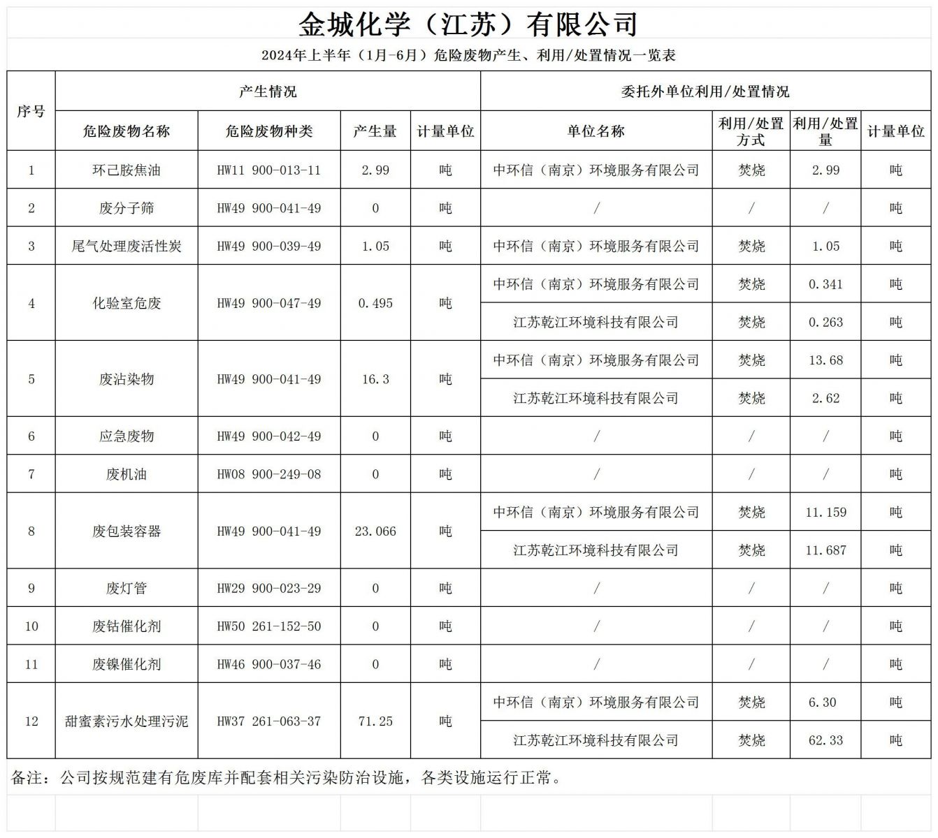 金城化學(江蘇)有限公司2024年上半年(1月-6月)危險危物產生、利用/處置情況一覽表